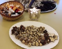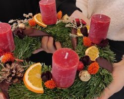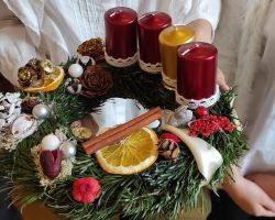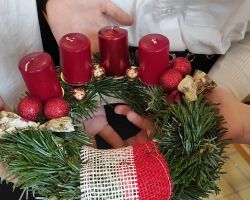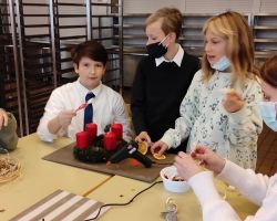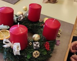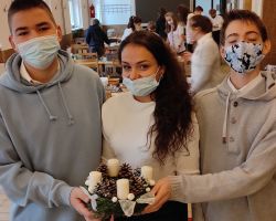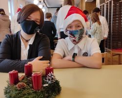 Mindeközben az ebédlőben – hamisítatlan karácsonyi hangulatban – adventi osztálykoszorú készítésen is részt vehettek néhányan. Iskolai asszisztensünk, Mózes Edina nagy szeretettel gardírozta a gyermekeket, ezúton is köszönjük neki az előkészítéssel és a lebonyolítással járó sok-sok munkát.