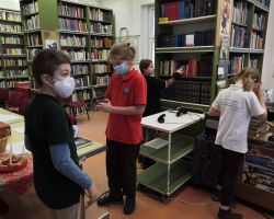 Örülök. Lendülnek a kezek a magasba – már mindenki járt könyvtárban. Iskolai könyvtár, Szabó Ervin, na jó, még egy helyen korrigálni kell, nem-nem, az, amiről te beszélsz, könyvesbolt és nem könyvtár. Nem baj, lényeg, hogy könyv/irodalom forog a kezedben, s nem csak tankönyvként. A téli szünet előtti utolsó héten, az 5.b osztály rendhagyó irodalom óráján elsősorban az iskolai könyvtár bemutatása, használatának ismertetése volt a célunk. Határozott keretet adott az órának Mészáros Dóra tanárnő feladatlapja. A „mi a kódex?” kérdés kapcsán történeti áttekintést végeztünk, megemlítettük röviden az ókor nagy könyvtárait, kitértünk a középkori magyar szerzetesi gyűjteményekre, szót ejtettünk az európai könyvnyomtatás kezdeteiről. Izgalmas illusztrációt kapcsoltunk az órához; a diákok megfoghatták a Párizsi Hóráskönyv, a Jordánszky-kódex, Komjáthy Benedek Szent Pál-fordításai 1533-as kiadásának másolati példányát és két unikális darabot is, az 1413-ban készült Lászlóffy-kódexnek (Concordantiae Caritatis), valamint II. Rákóczi Ferenc fejedelem ábécés könyvének fakszimiléjét. Ezen utóbbi mű 1674-es eredetijéből egyetlen példány maradt az utókorra. Nagy sikert aratott a gyermek Rákóczi saját kezű „betűtanuló” bejegyzése. Kézről-kézre járt a Vizsolyi Biblia hasonmás kiadásának első kötete amikor elhangzott, hogy 1590-ben a kész nyomdatermék 5 kg-ot nyomott… A gyerekek ügyesen keresték a könyvtárban fellelhető Móra-műveket, megtalálták Jézus apostolainak nevét és azt is megtudták, hol lehet utána nézni a Lónyay utca történetének. Felfedezték a tankönyvek helyét a könyvtáron belül, s arra is fény derült, hogy a következő kötelező olvasmányuk, a Pál utcai fiúk, pontosan melyik polcon található. Pihenésképpen filmvetítés követte az érdemes munkát. Köszönjük a dokumentum-kölcsönzést a Piarista Központi Könyvtárnak.