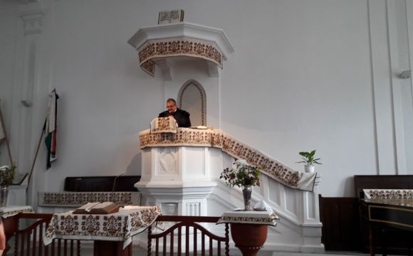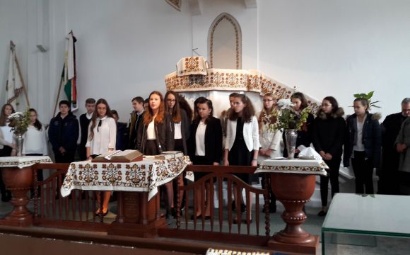 Osztályfőnök és helyettese, igazgató úr és helyettese is a küldöttség tagjai voltak. Szép számmal jöttek el diákjaink szülei is, jó érzés gyülekezeti közösségben is együtt lenni. Nagytiszteletű úr pedig néhány percre iskolává alakította a templomot: az úrasztala köré hívta a gyermek-istentisztelet résztvevőit. A gyerekek egymás kezét fogva várták lelkészük tanítását és kérdéseit. Ez a kedves kép megmaradt bennem, bár tudnánk ilyen Istenre figyeléssel egymást erősíteni!