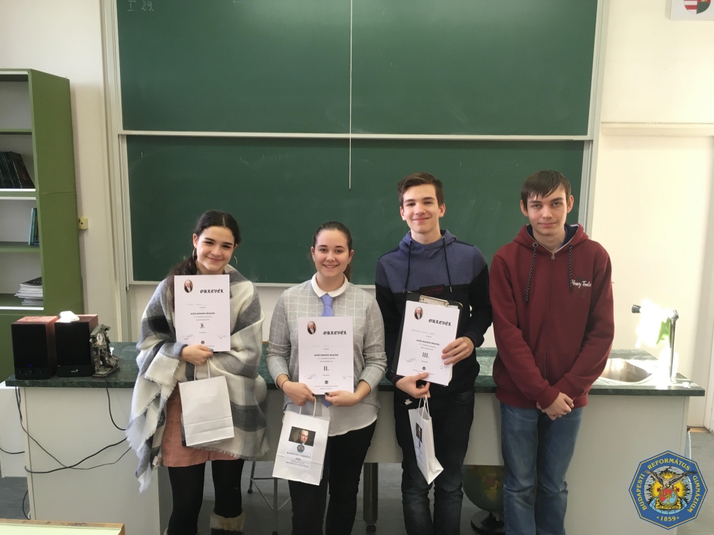 A 11-12. évfolyamon I. helyezett lett Jancsurák Bence (12.a) és II. helyezett lett Módra Attila (11.d) tanulók. A zsűri különdíjat is osztott, ezt Róth József (10.b) kapta meg. Így Bello Anna és Jancsurák Bence képviseli iskolánkat a fővárosi fordulón.