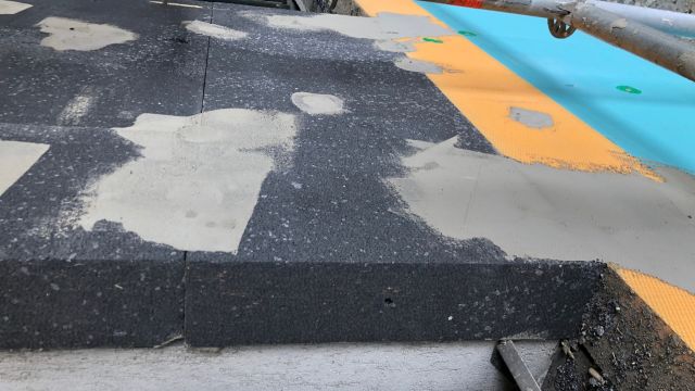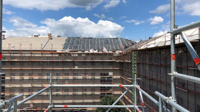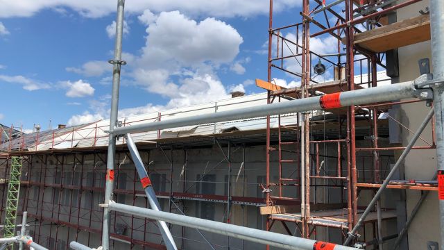 A homlokzati hőszigetelés több mint fele elkészült már, az utca porterhelését az állványzatok hálózásával próbáljuk csökkenteni.