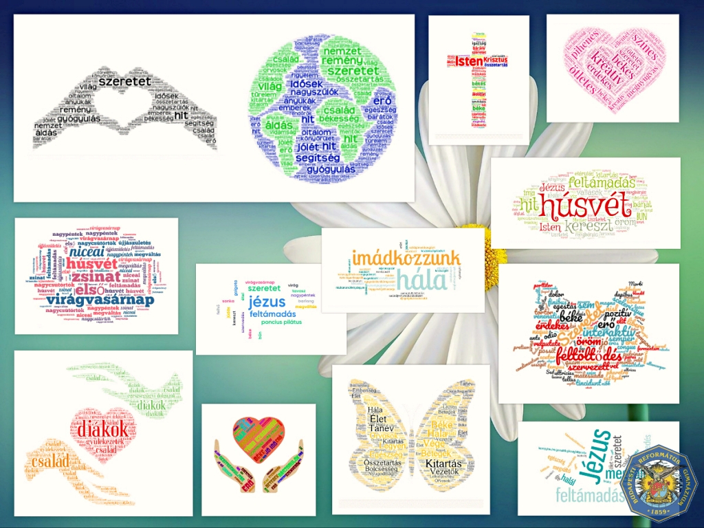 A csendesnapon a nagyhét kiemelkedő eseményei közül néztünk meg néhányat. Figyeltünk Jézus virágvasárnapi bevonulására (Lk 19,28-44) és a nagycsütörtöki lábmosás történetére (Jn 13,1-11). Felidéztük Jézus kereszten mondott hét utolsó szavát, és Urunk halálában és feltámadásában kapott új életre pedig a földbe vetett búzaszemről szóló tanítása emlékeztetett bennünket (Jn 12,20-33). A tanító részeket feladatokkal tettük interaktívvá, hagytunk időt arra, hogy a közösség tagjai imádságban csendesedjenek el Istenünk előtt, és énekekkel gazdagítottuk csendesnapunk lelkiségét. A napot azzal zártuk, hogy osztályonként szófelhőt készítettünk azokból a gondolatokból, melyeket a diákok fontosnak tartottak. Ezekből párat megosztunk a mellékelt fotókon.