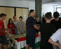 Június 19-én, a magyar-német EB meccs előtt szurkolói napot tartottunk iskolánkban a DÖK kezdeményezésére. A szurkolói öltözetben vagy trikolórban érkező diákok trikolór túró rudit kaptak, és délelőtt 10-ig lehetőség volt benevezni a dekázó bajnokságba is. A sok bátor és ügyes résztvevőt diáktársaik szurkolása bíztatta, a szabályszerűséget a DÖK képviselői felügyelték. A dekaverseny győztese végül 176 érintéssel Gőcze Ákos 9.C osztályos tanuló lett, aki egy focilabdát nyert. Köszönjük mindenkinek a részvételt! Hajrá Magyarok!